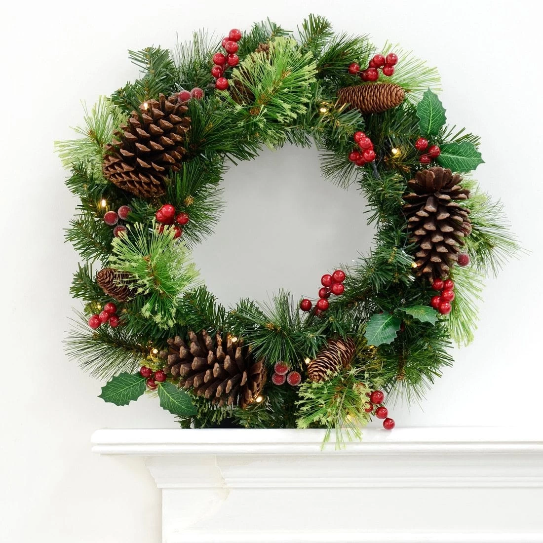 • Decorated with berries, pinecones & holly leaves