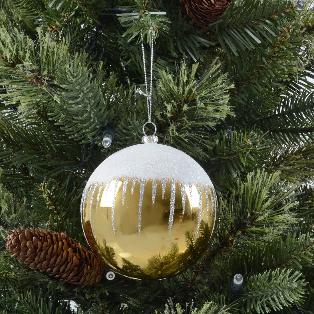 Each set comes with three round mirror finish baubles, each styled white glistening snow on the top and glittery drips round the sides. The baubles all have a diameter of 10cm and are finished with a silver cap and silver hanging thread. Choose from silver, red and gold.