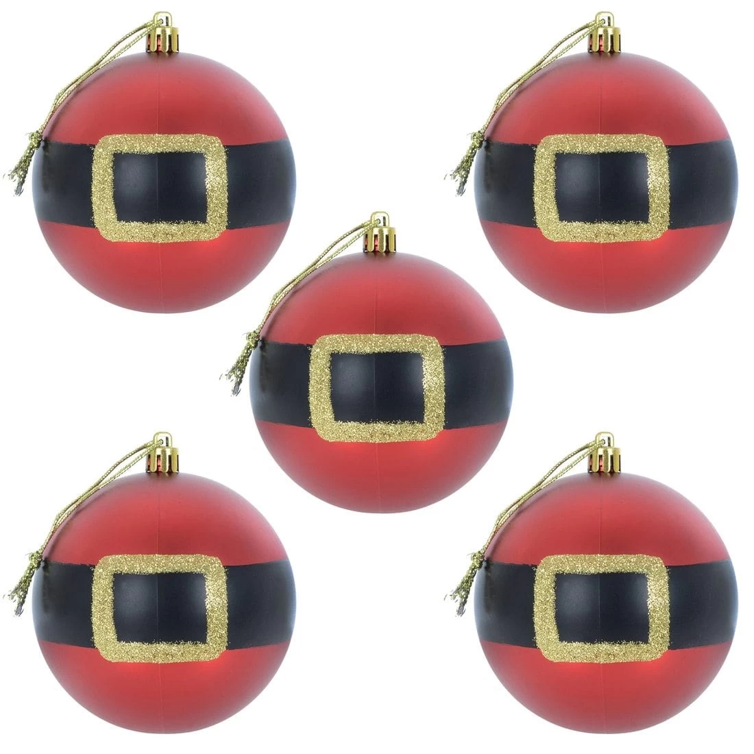The set comes with five round shatterproof baubles, each styled with a black belt around the middle, a gold glittery buckle and a gold cap and hanging thread. The baubles all have a diameter of 10cm.