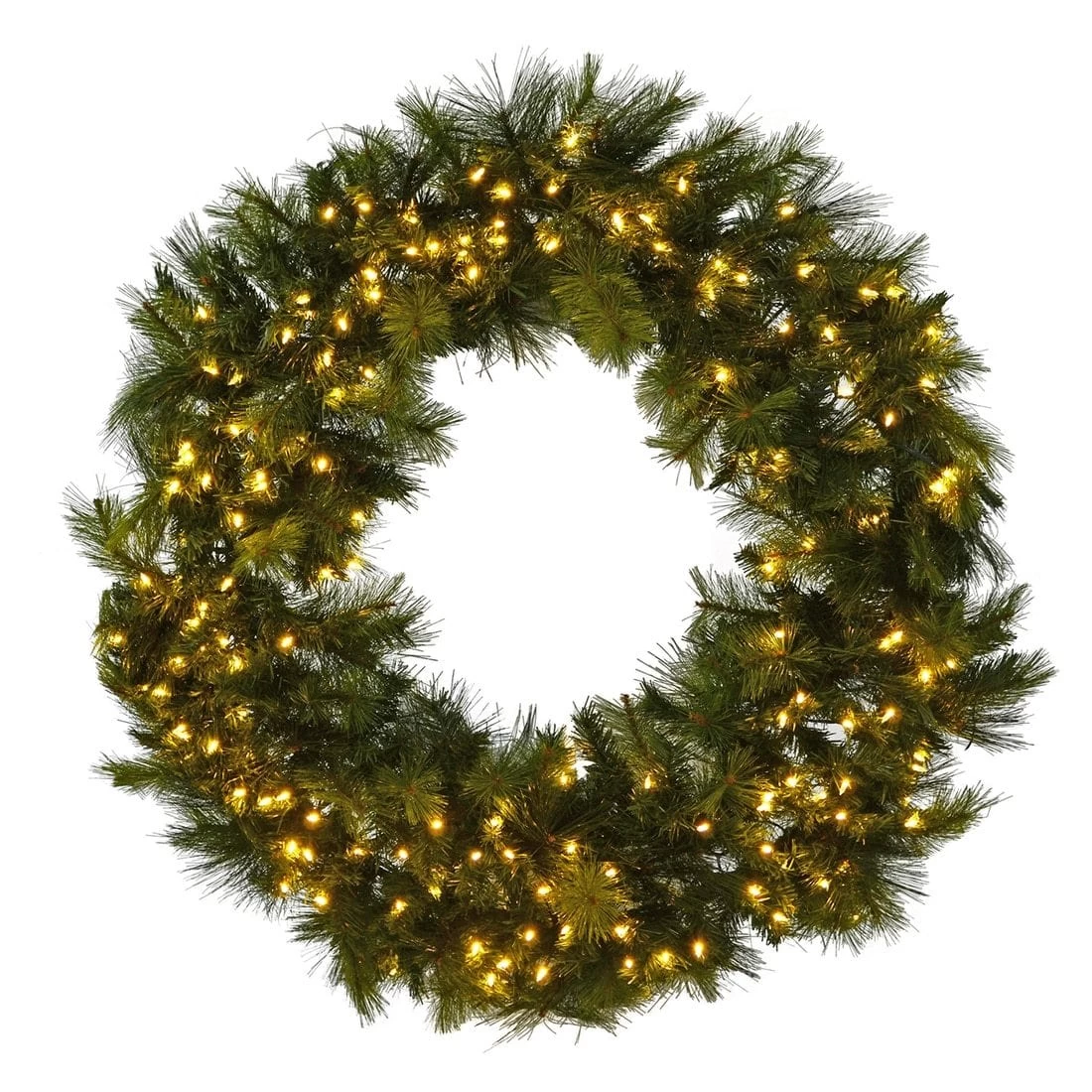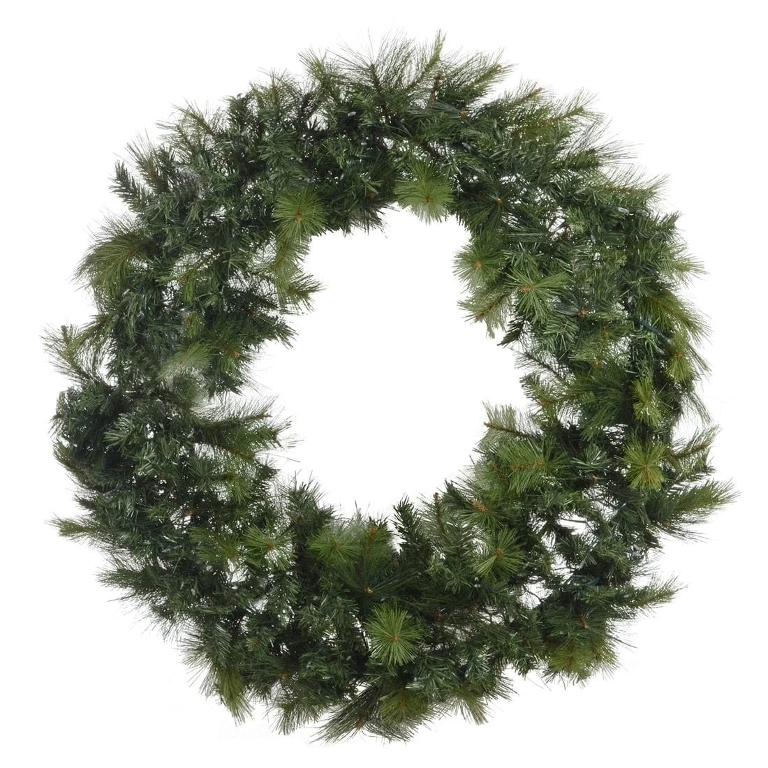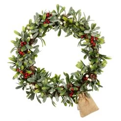 This traditional style round Christmas wreath has green pine branch foliage with 350 mixed PE and PVC tips for a thick and bushy effect. The branches are attached to a metal wire base for easy hanging.