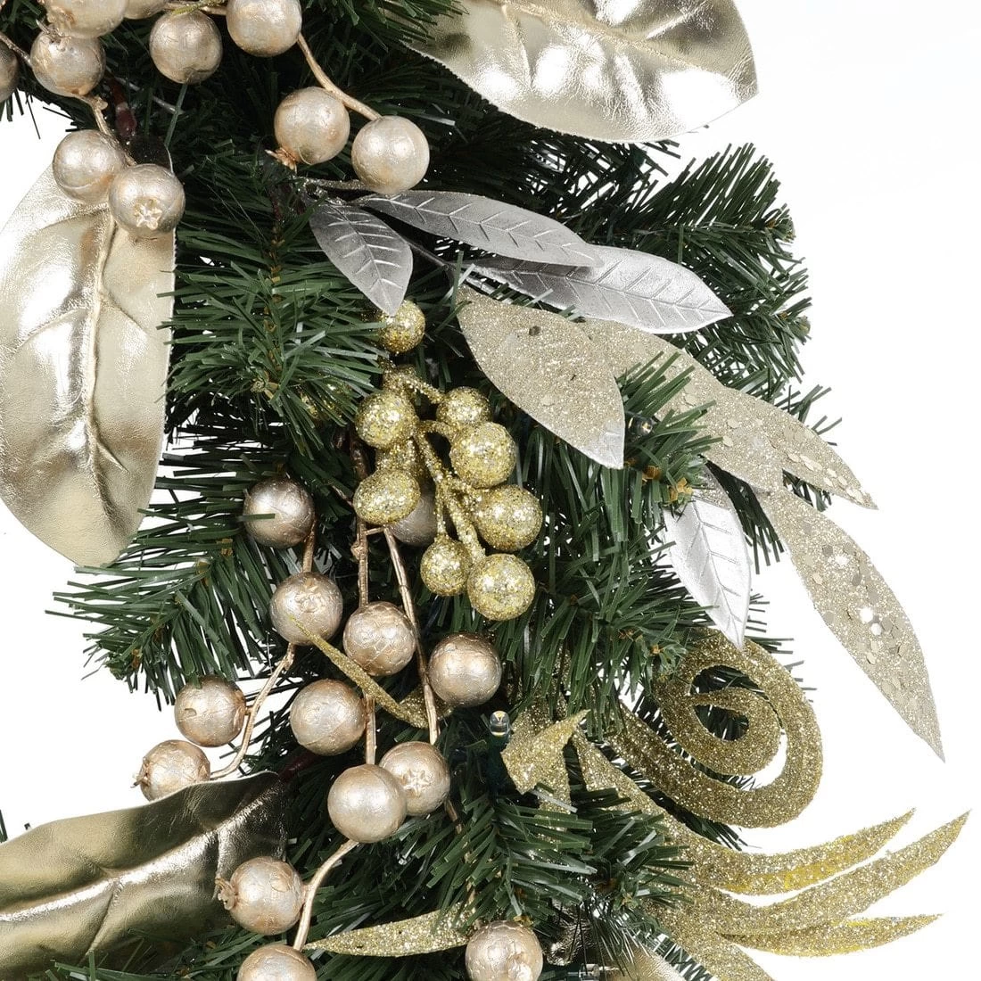 This is surely the ultimate in Christmas decor for your door! The 60cm (24″) Christmas pre-lit wreath decoration creates a sparkling, warm invitation to your home, inside or out. This gorgeous wreath is battery operated with 20 warm white LED lights woven through the green pine foliage. Decorated with sparkling silver and gold leaves and berries, this glamorous door decoration is perfect for the festive season!