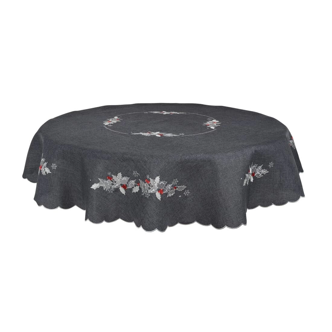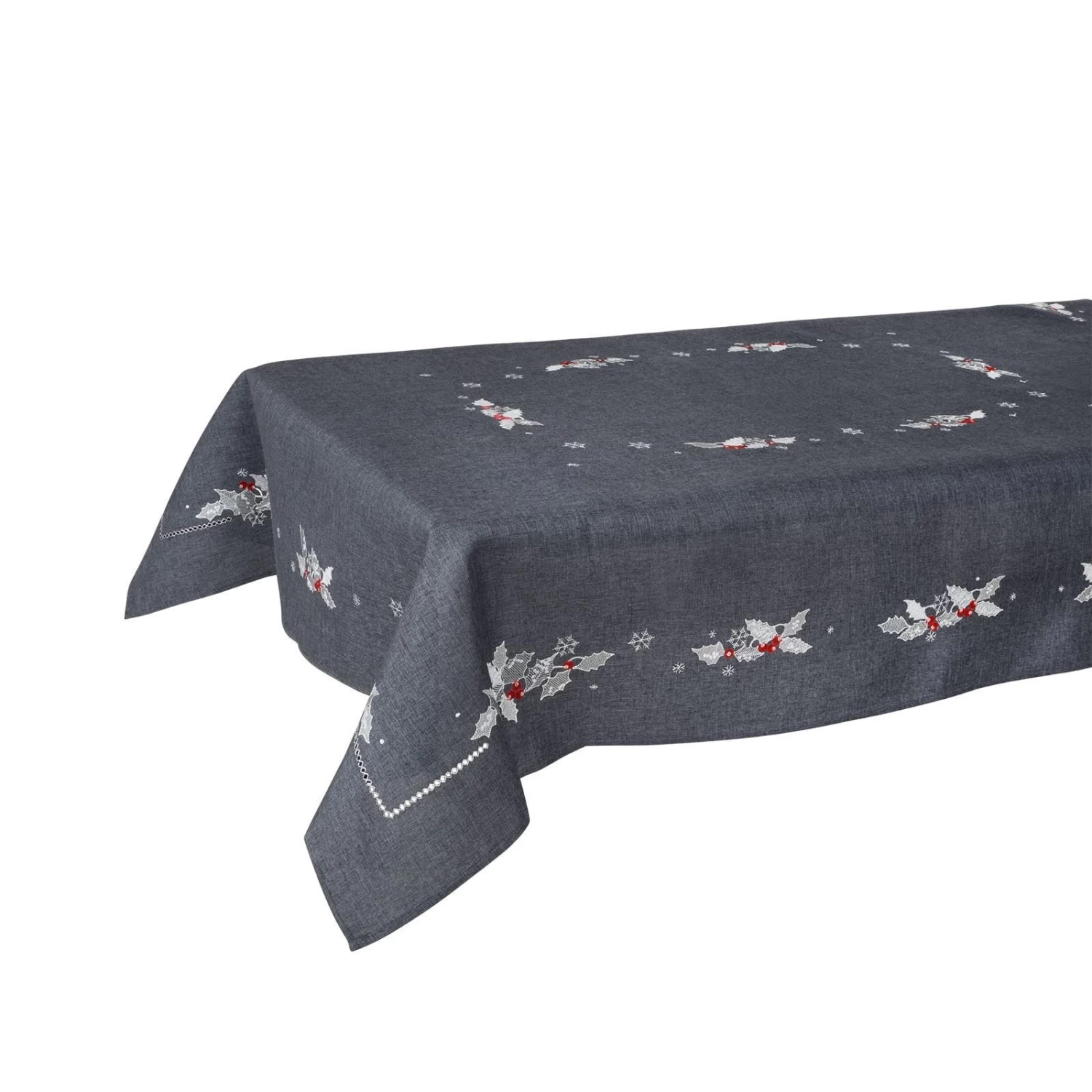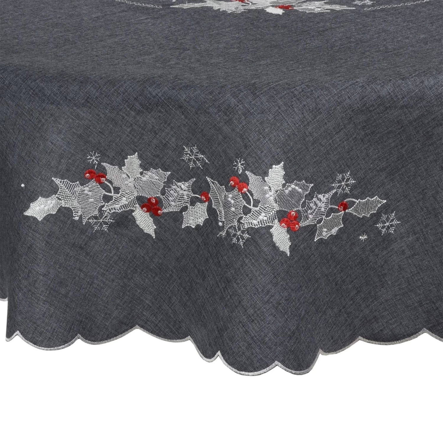 These tablecloths are available in red, dark grey or biscuit with embroidered holly leaves and berries.