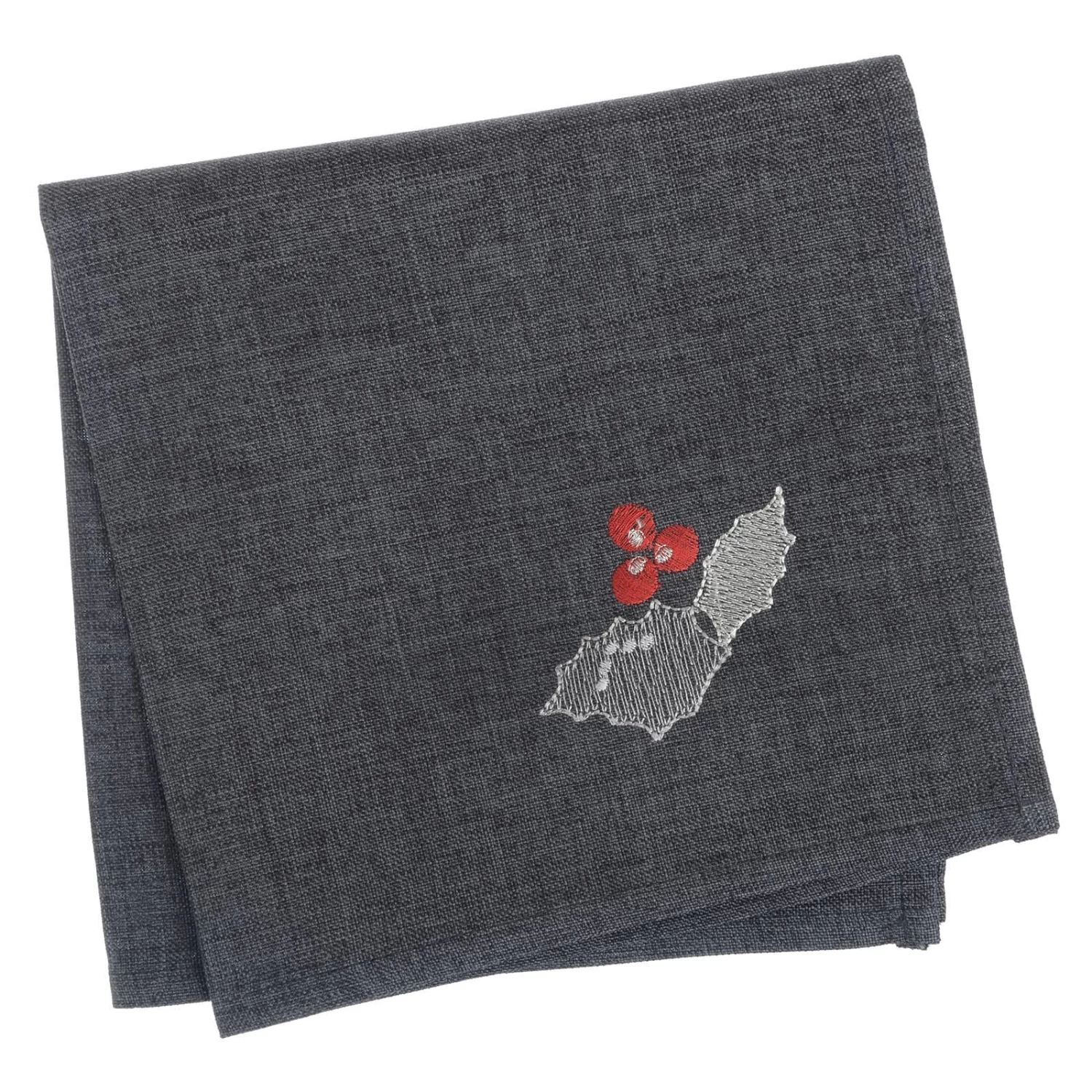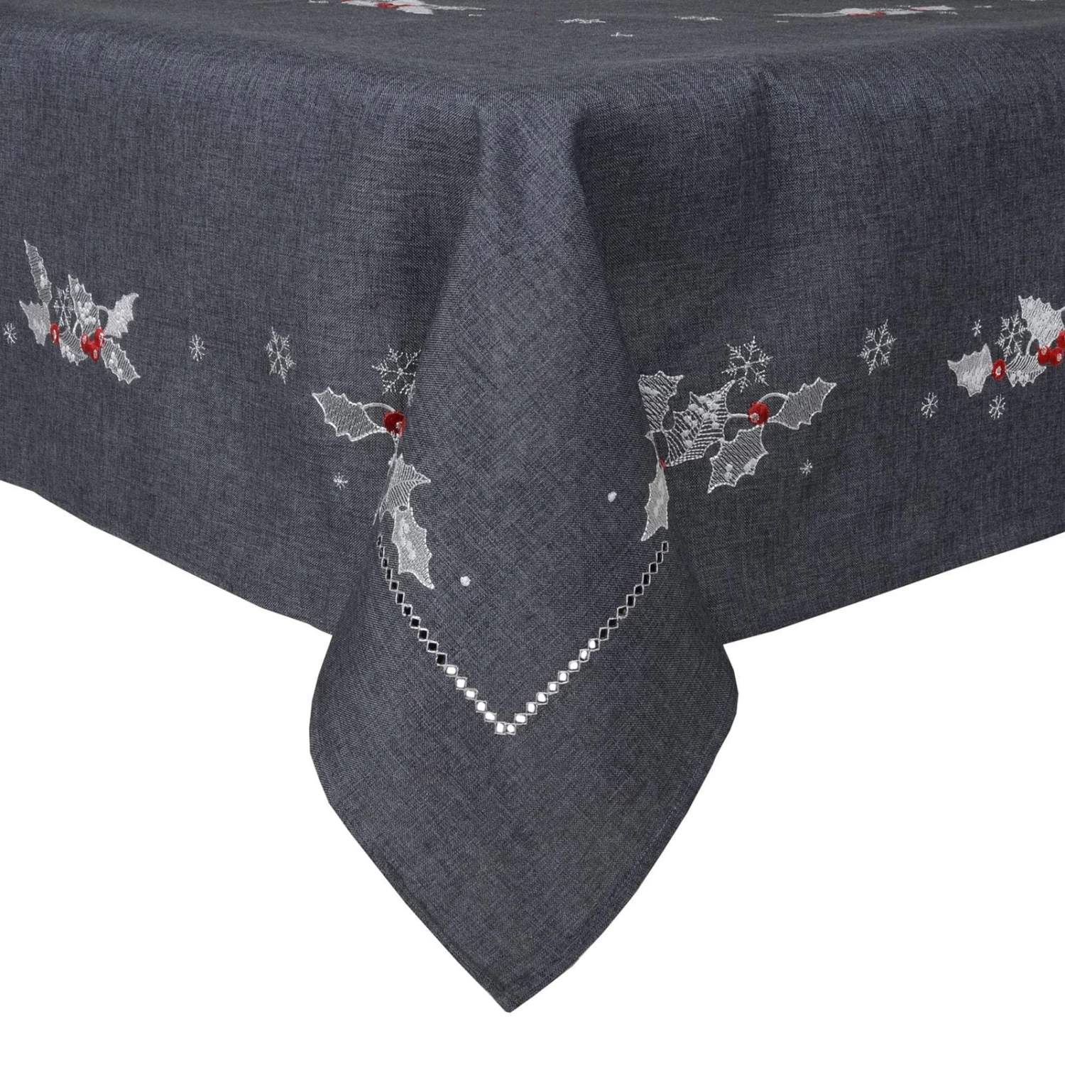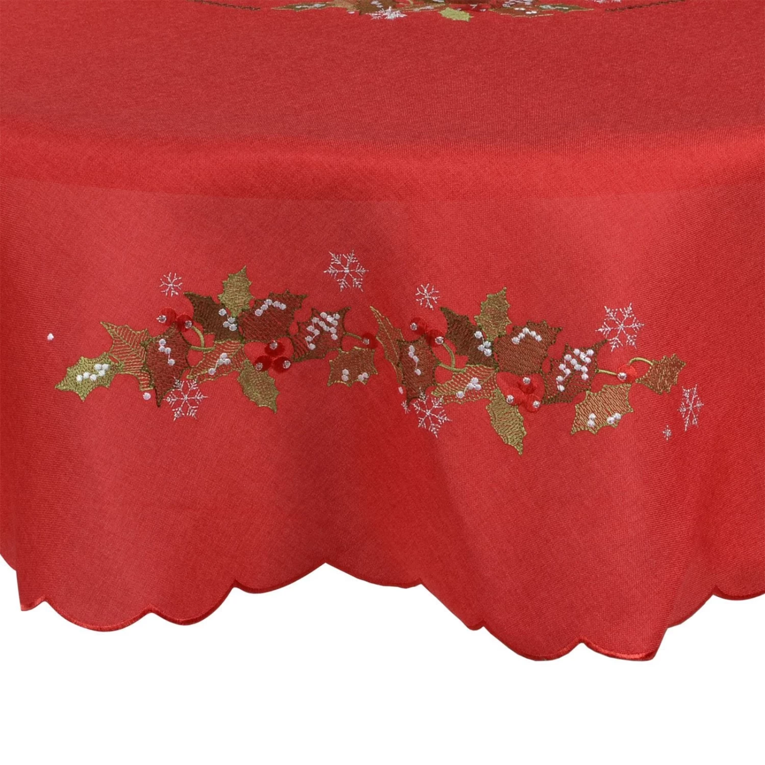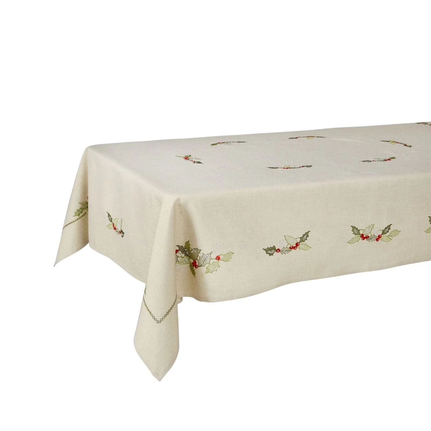 These tablecloths are available in red, dark grey or biscuit with embroidered holly leaves and berries.