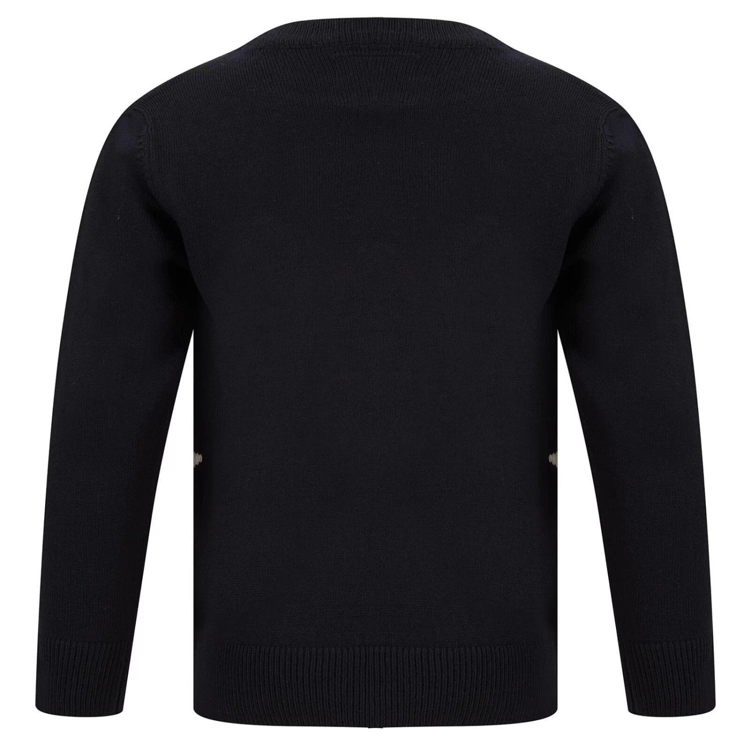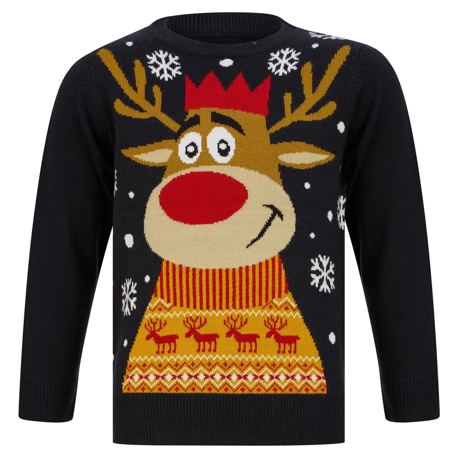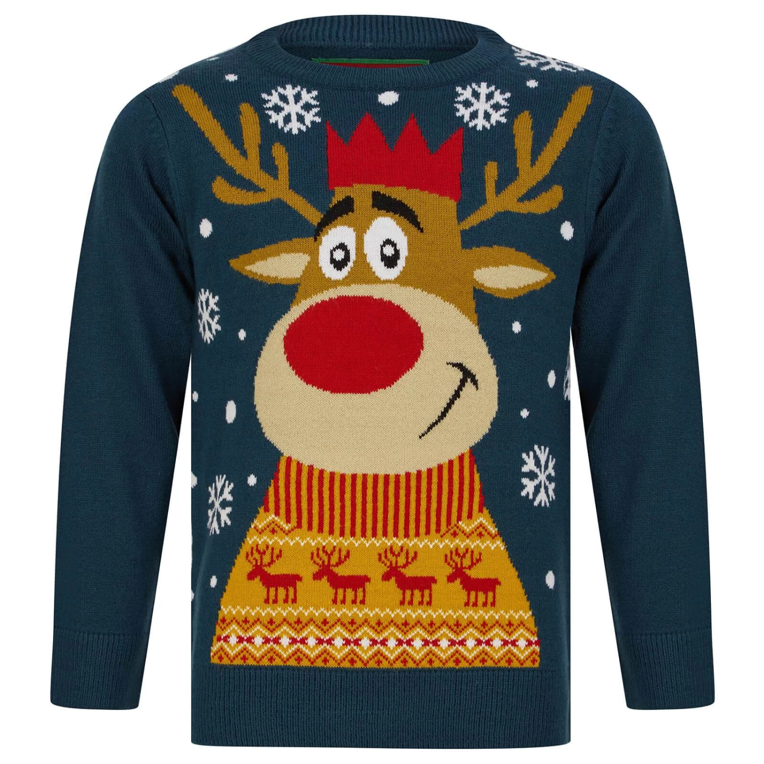 Your little one will love wearing this novelty Christmas jumper over the festive season. The xmas sweater features Rudolph the reindeer with a big smile, wearing a red party hat and Fairisle pattern jumper. The soft knit, crew neck Christmas jumper for children is available in Teal or Ink colours and in child sizes from age 5 to 12. Perfect for family seasonal celebrations, Christmas Jumper Day and a great gift idea!