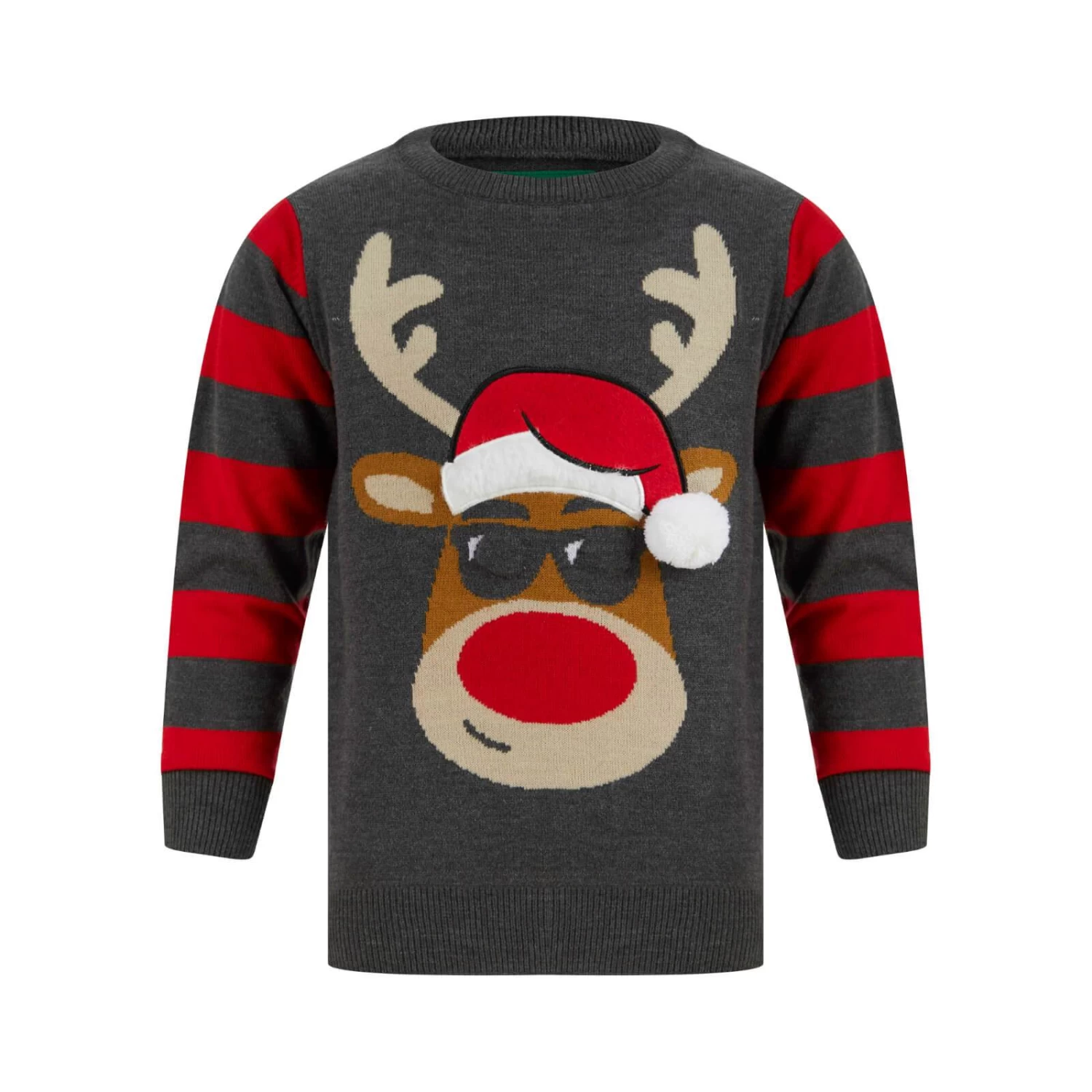 It features striped arms with a red-nosed reindeer on the front wearing a santa hat with faux fur trim and a 3D pom pom and a pair of cool shades that light up with multicoloured lights.
