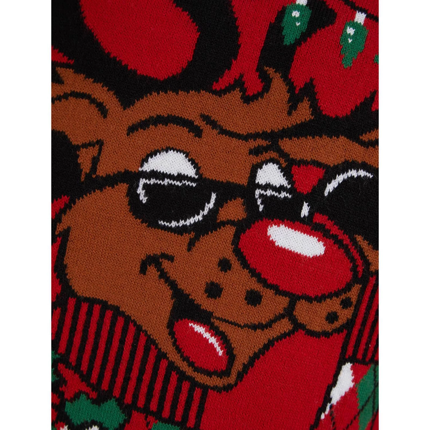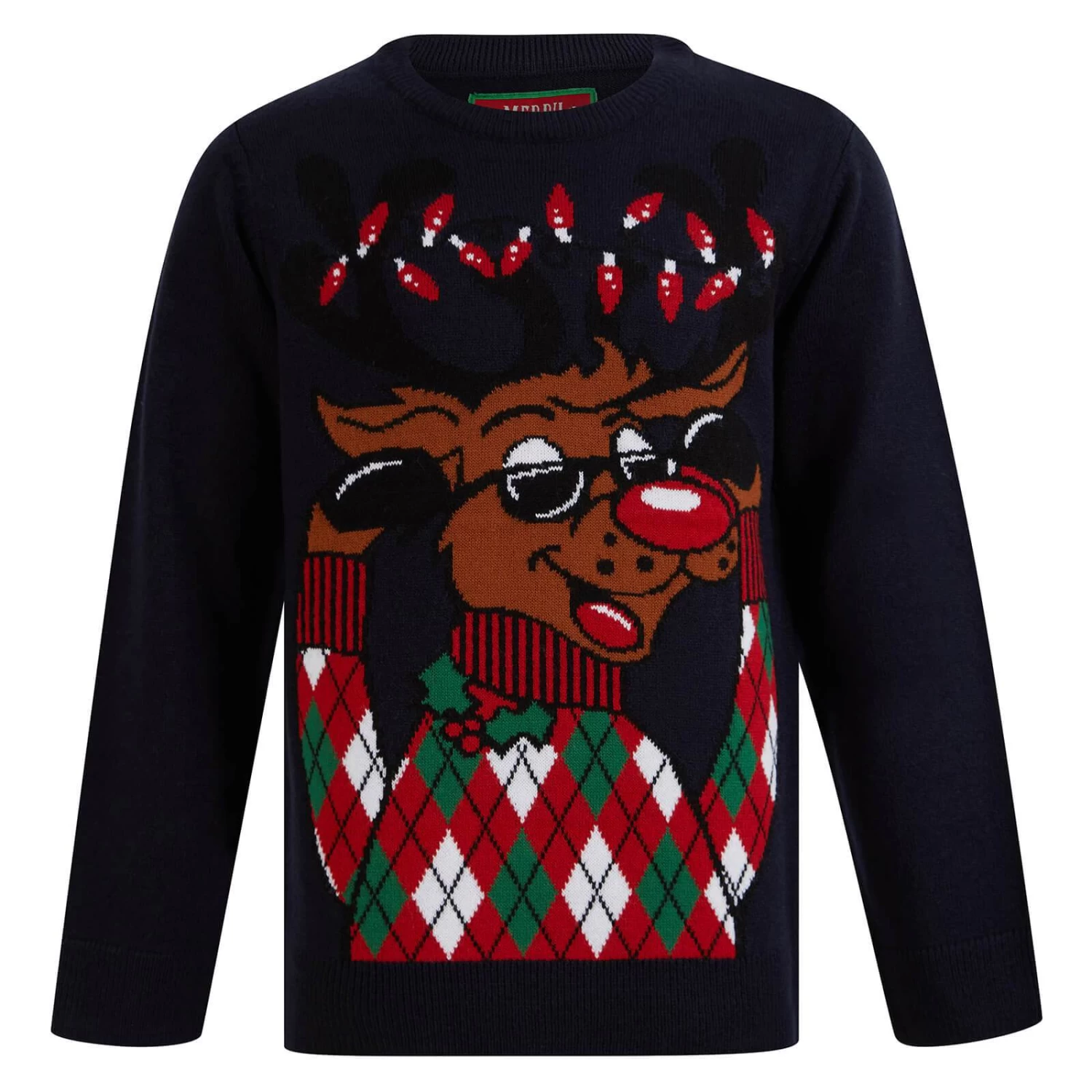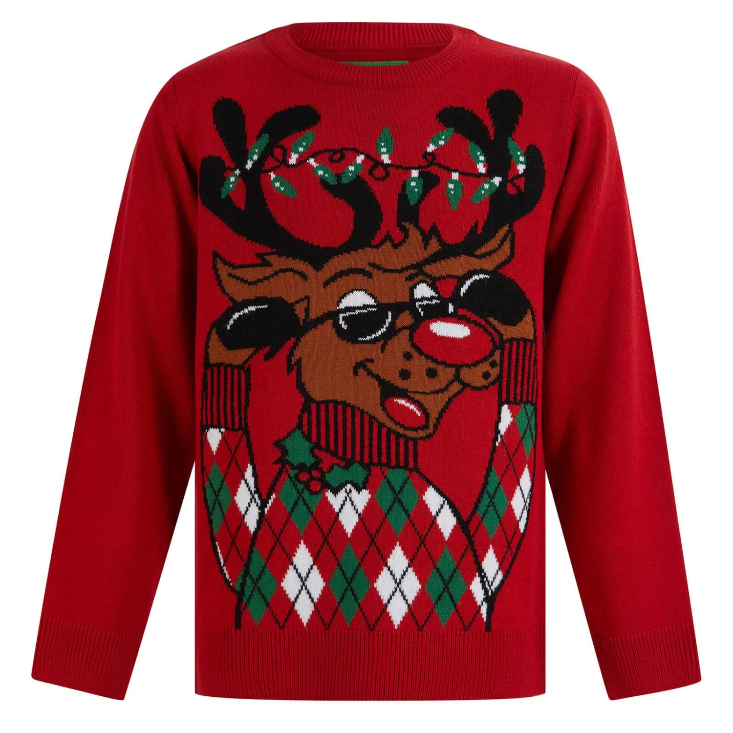 Bring some much needed Christmas cheer with this fabulous kids jumper. It features Rudolph the red-nosed reindeer wearing an argyle print style jumper, cool shades and some Christmas lights around his antlers.