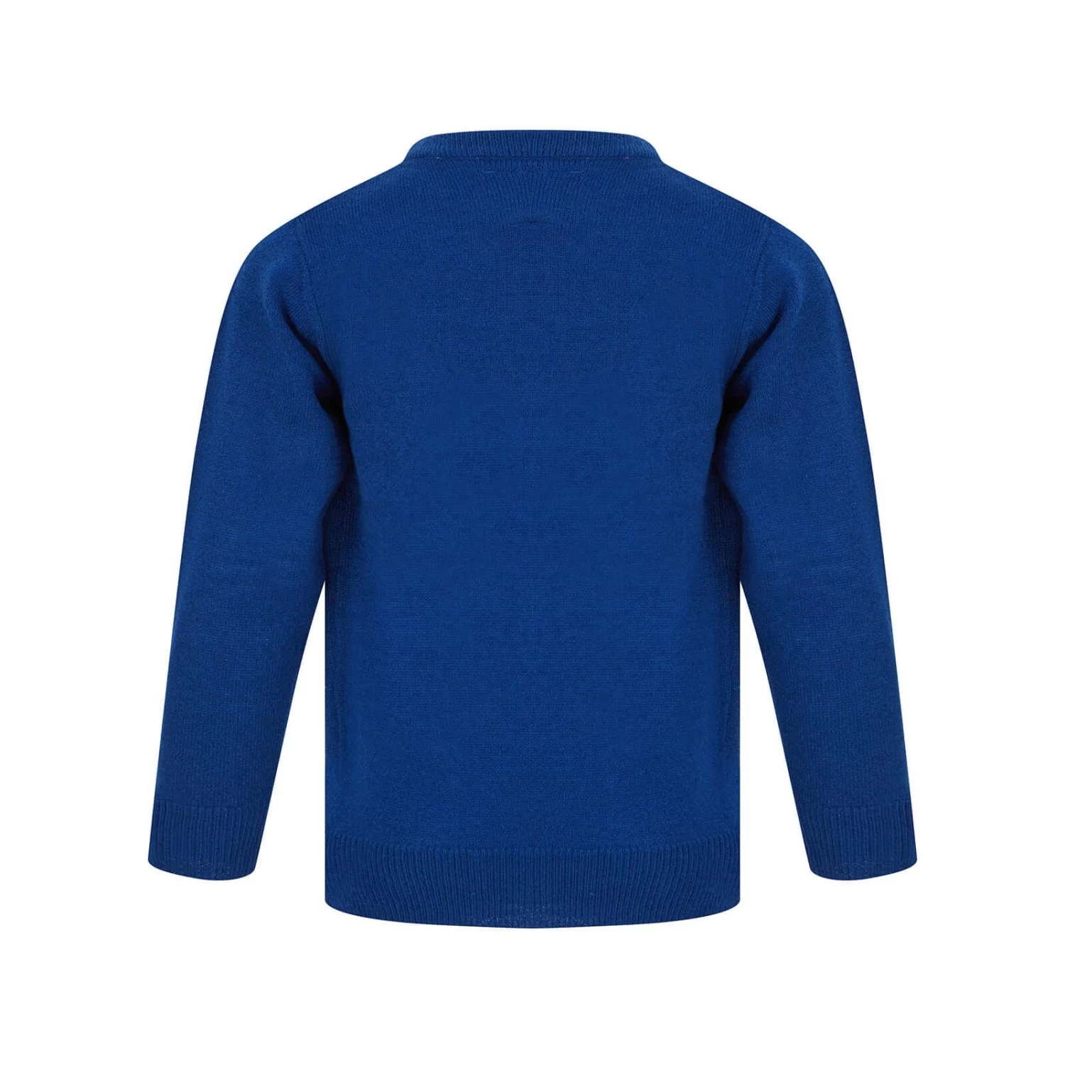 Your little one will love wearing this novelty Christmas jumper over the festive season. The xmas sweater features Rudolph the reindeer with a cheeky smile, wearing a Santa hat, striped scarf and festive jumper of his own holding a pile of snowballs while ready to take aim and fire with the one in his hand. The soft knit, crew neck Christmas jumper for children is available in a choice of Sapphire Blue or Ink and in child sizes from age 4 to 12. Perfect for family seasonal celebrations, Christmas Jumper Day and a great gift idea!