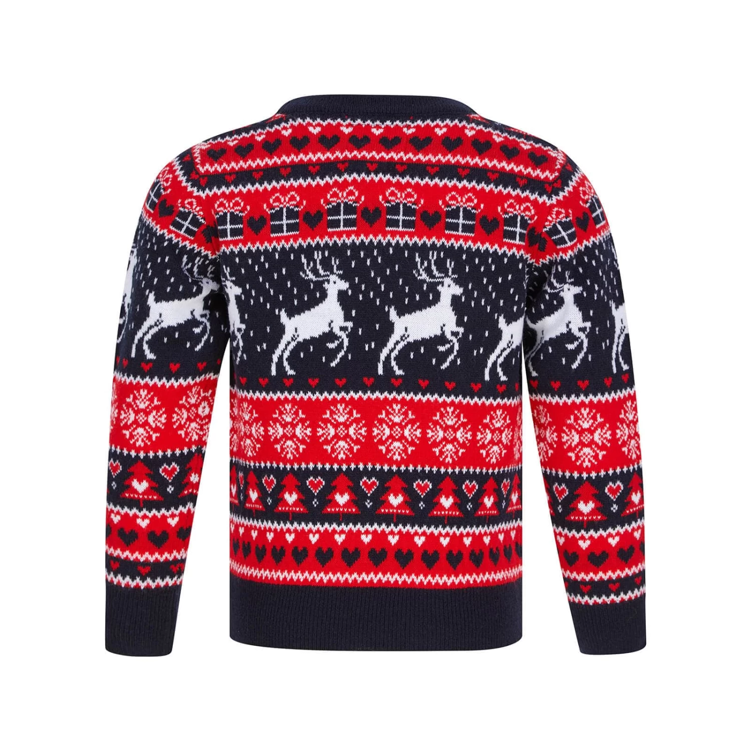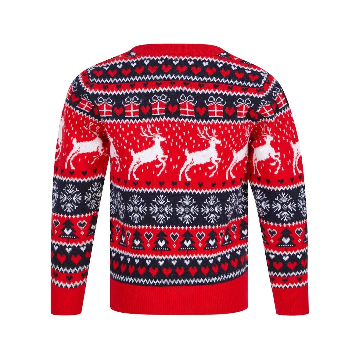 This Christmas jumper for children features an adorable traditional Fair Isle type pattern with reindeer, presents, snowflakes, hearts and christmas trees all on a festive red and blue background.
