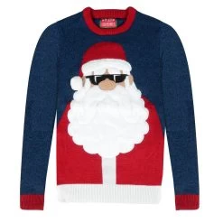 Your little one will love wearing this modern style Christmas jumper over the festive period. It features Rudolph on a red snowboard with white pom pom hat and ski jump slope landscape. Maybe you can spot Santa who didn’t quite nail the landing! The soft knit, crew neck Christmas jumper for kids is available in dark green or ink colours and in child sizes from age 5 to 13. Perfect for family seasonal celebrations, Christmas Jumper Day and a great gift idea!