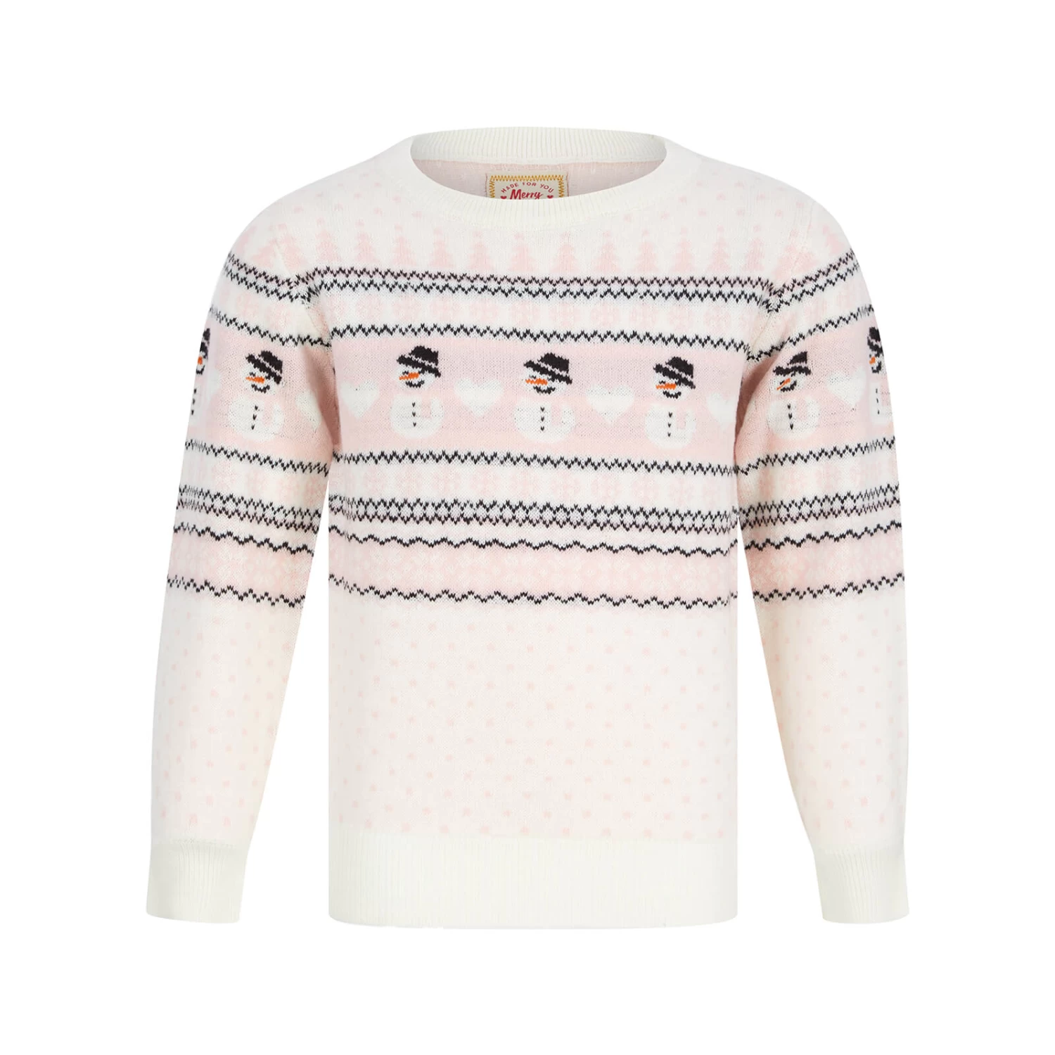 This Christmas jumper for children features an adorable traditional Fair Isle type pattern with Snowmen, snowflakes and Christmas trees on a festive background.