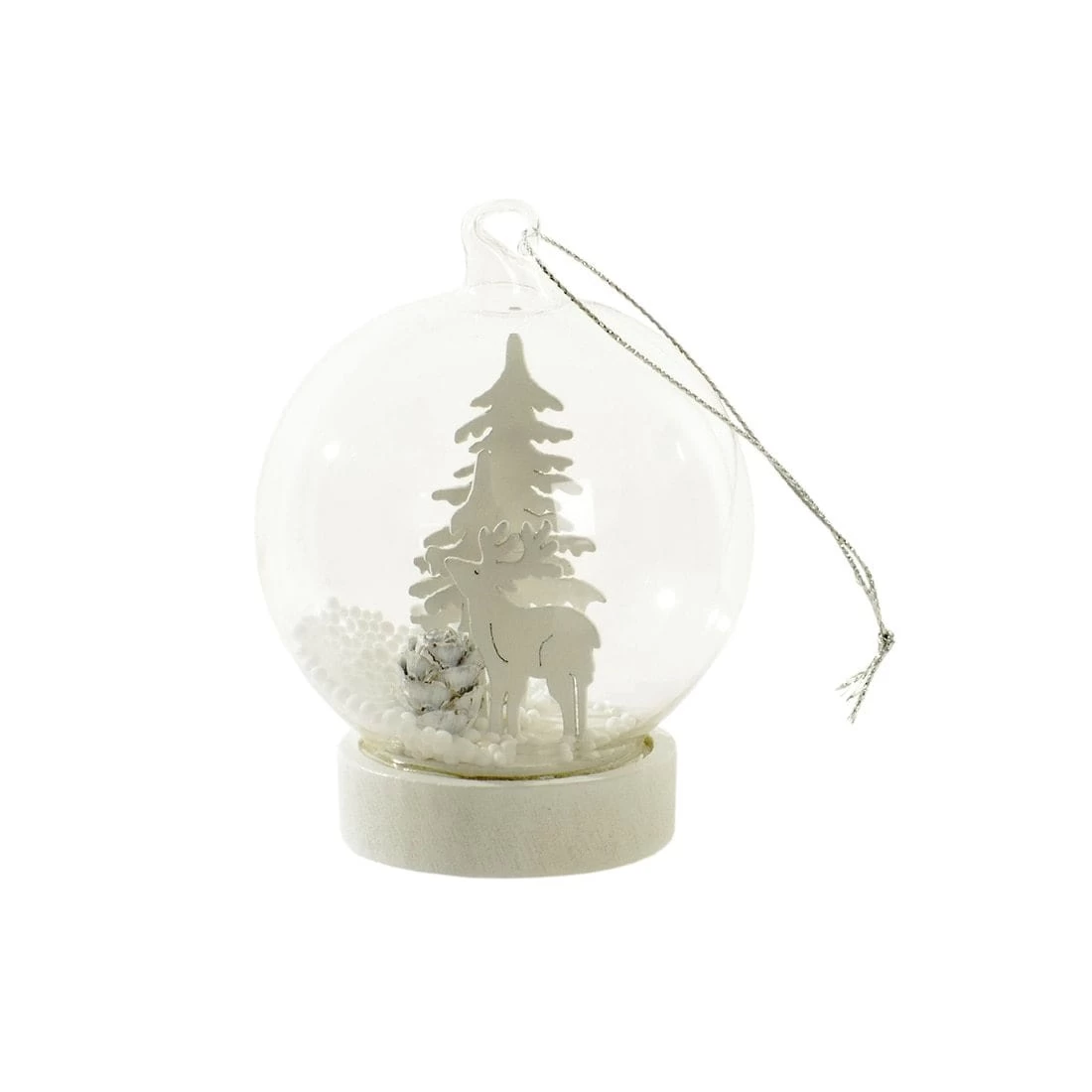 Hang this gorgeous glass bauble decoration on your tree and switch it on for a cosy warm white light. Inside the glass bauble is a wooden festive winter scene including a reindeer with trees and little fake snowballs which can move around if the bauble is shaken!