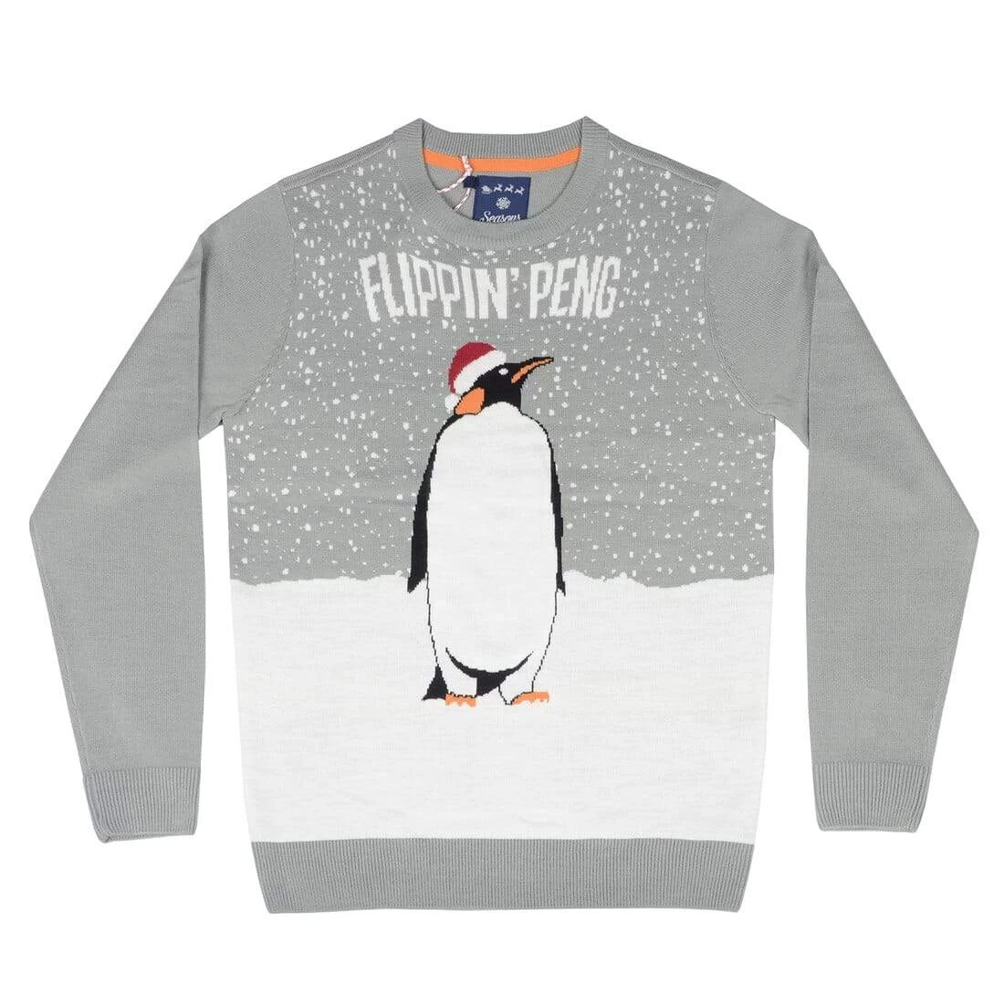 Enjoy the festive spirit in this novelty knit Christmas sweater for men. It features a grey and white snowy background with a large penguin and the slogan “Flippin Peng”. This fun Christmas jumper is available in mens sizes S, M, L, XL or XXL. A great gift idea for the man in your life!