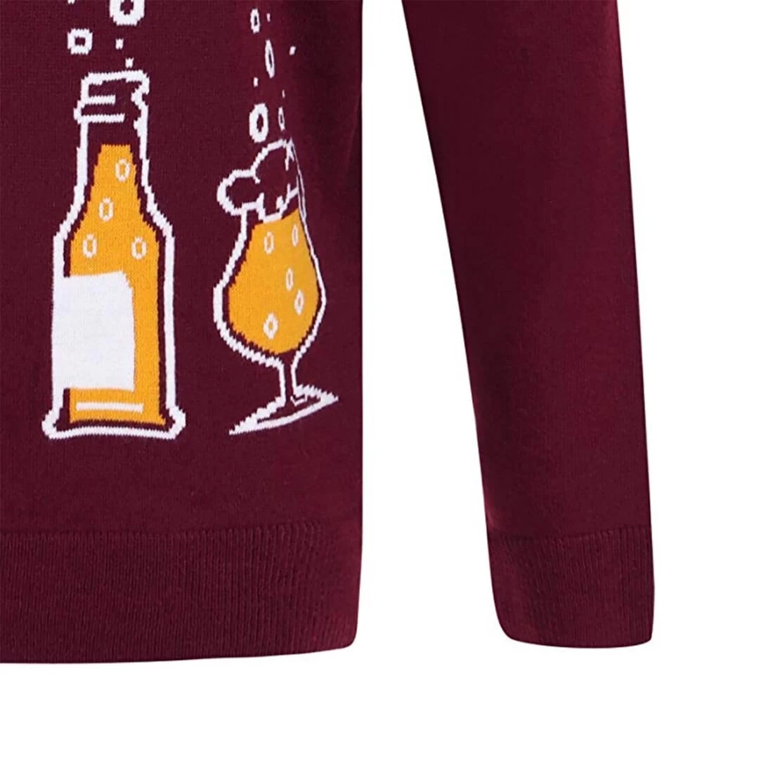 These jumpers are available in oxblood or ink blue colours and in mens sizes small, medium, large, extra large and extra-extra large. Perfect for Christmas jumper day, having a laugh at the dinner table or as a gift for your drinking buddy.