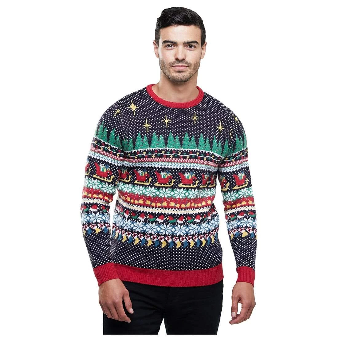 Get into the Christmas party mood in this novelty knit Christmas sweater. It features a multi-colour Nordic style pattern with snowflakes, fairy lights, santa hats, stockings, sleighs, reindeer and pine tree design. The crew neck Christmas jumper for men is available in sizes S, M, L, XL or XXL. Perfect for family seasonal celebrations and a great gift idea for the man in your life!