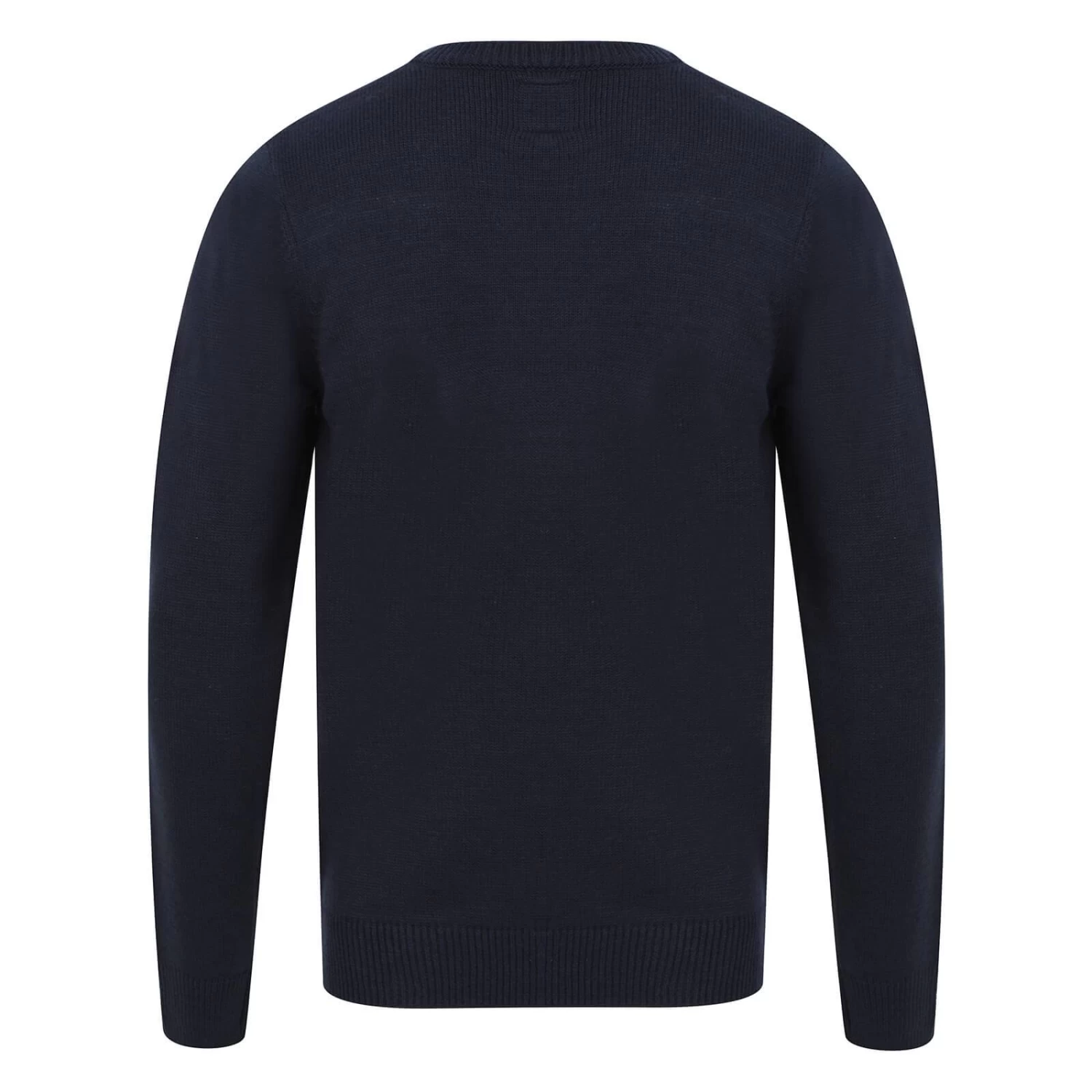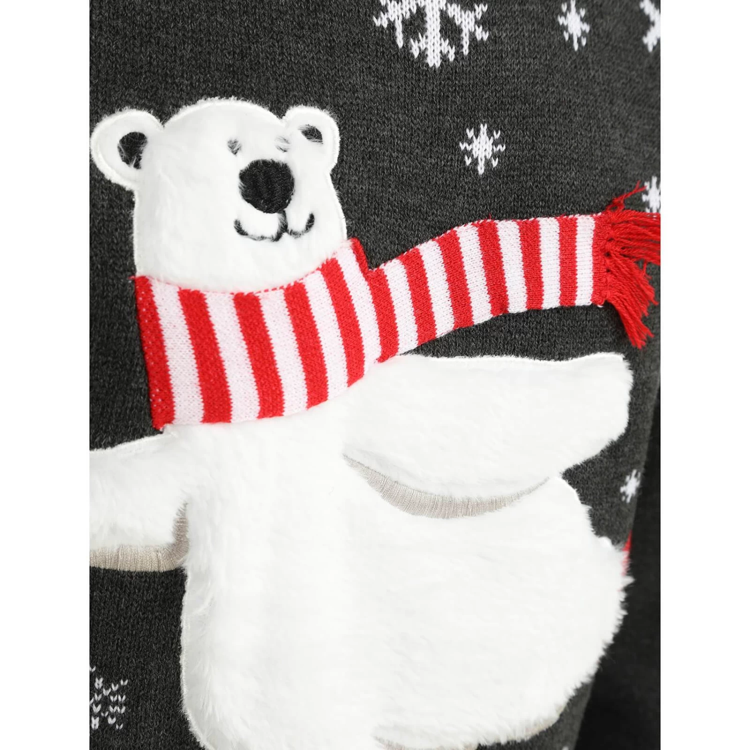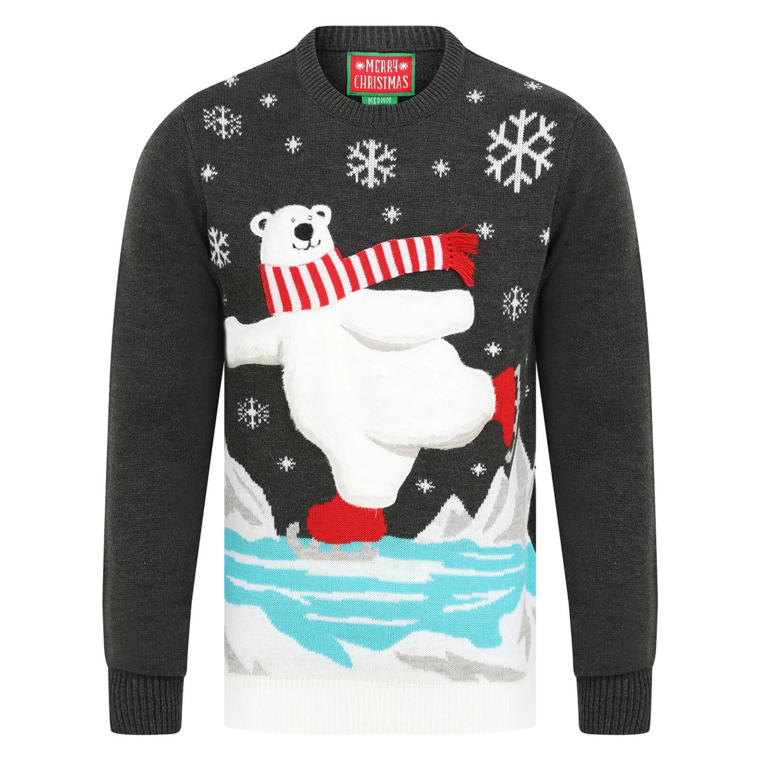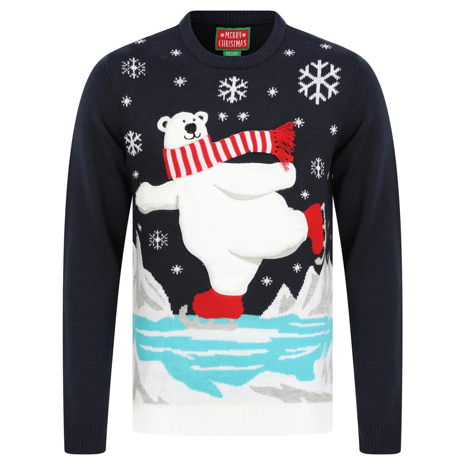 This soft knit, crew neck mens Christmas jumper features a white fluffy polar bear with a striped red and white scarf, ice skating wearing red skates with snowflakes falling in the background to complete that festive look.