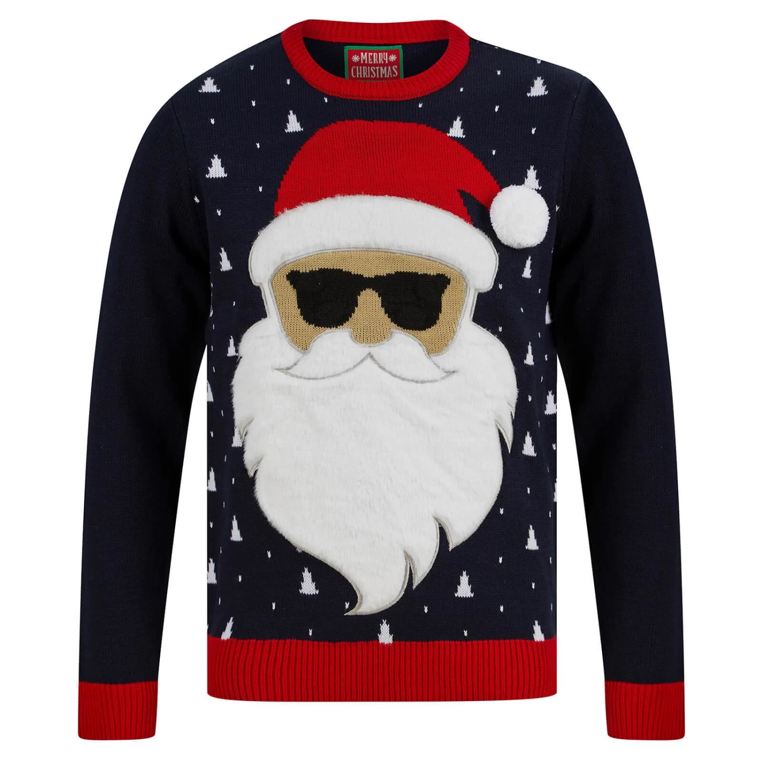 It features a large santa face with a faux fur beard, 3D pom pom and faux fur trim on santa hat and light-up shades. What more do you need in a christmas jumper?