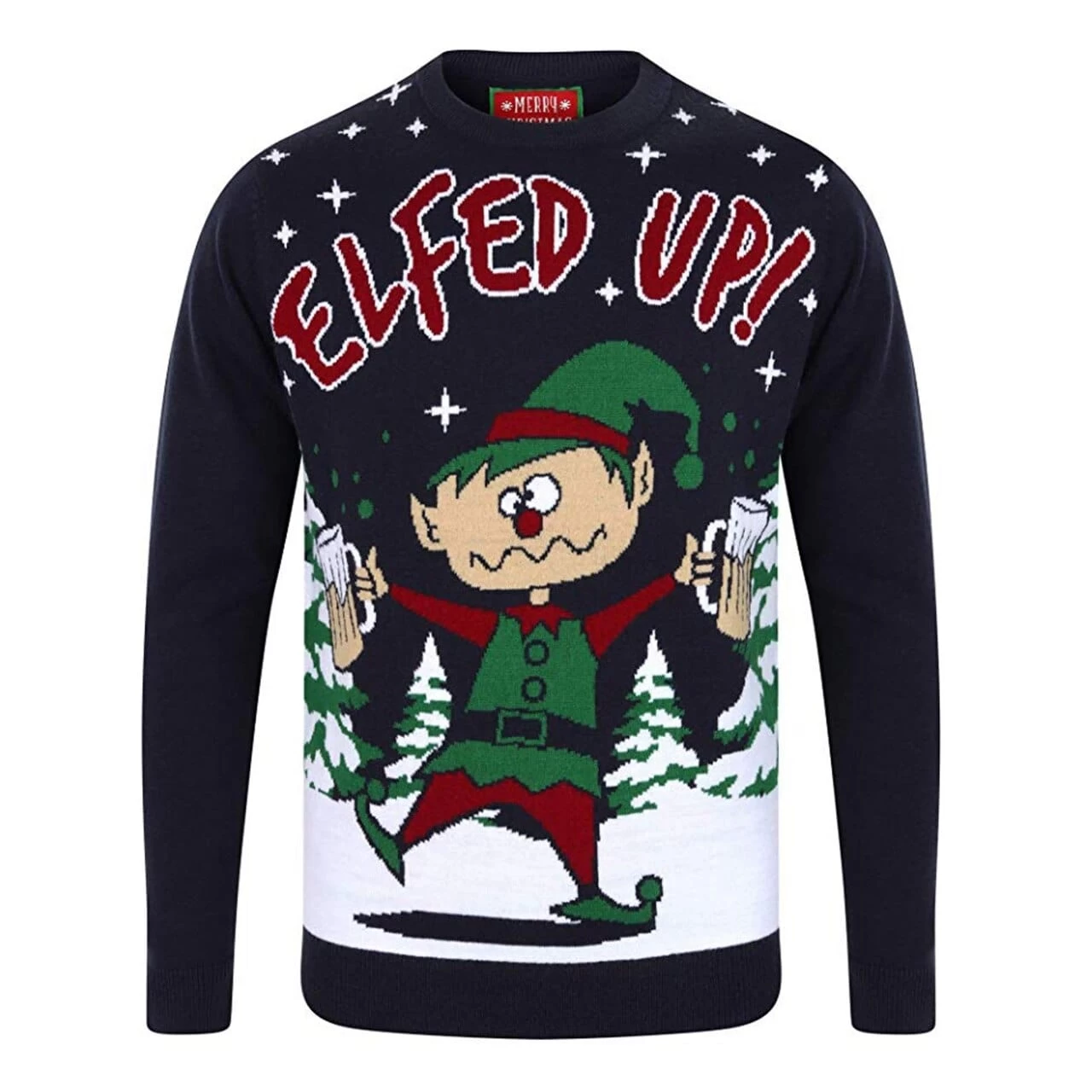 Each knitted jumper has a novelty pullover design with the words “ELFED UP” and a boozy elf drinking beer outdoors in the snow. Perfect for Christmas nights out, Christmas jumper day or as a gift for your drinking buddy.