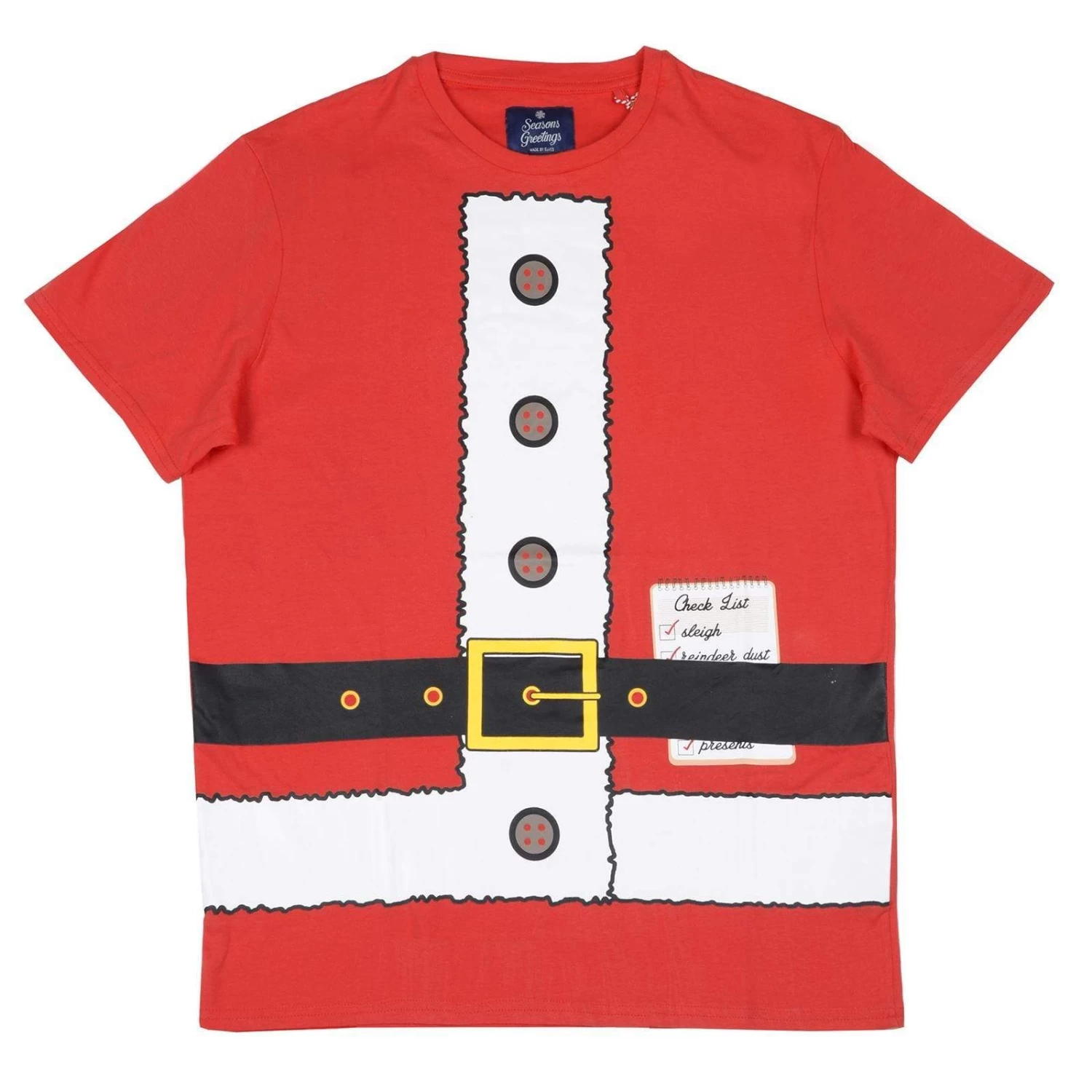 Enjoy the Christmas spirit in this festive t-shirt for men. The fun red tee features big black buttons and belt with white trim print detail. This Father Christmas t-shirt is available in men’s sizes from S, M, L, XL or XXL. Perfect for the office party and a great gift idea for the man in your life!