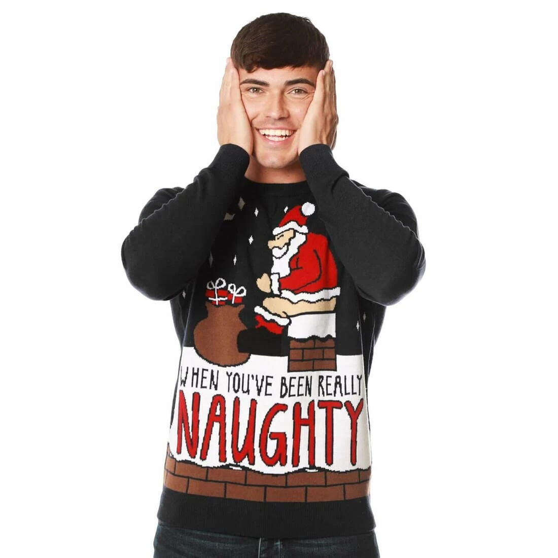 Get the laughs at the office party in this novelty Christmas jumper for men. Featuring Santa sitting on the chimney with his red trousers round his ankles and slogan when you’ve been really naughty. This soft knit, crew neck Christmas jumper is available in jet black or eclipse blue, and in mens sizes S, M, L, XL or XXL. Perfect for festive celebrations and a great gift idea for the man in your life!