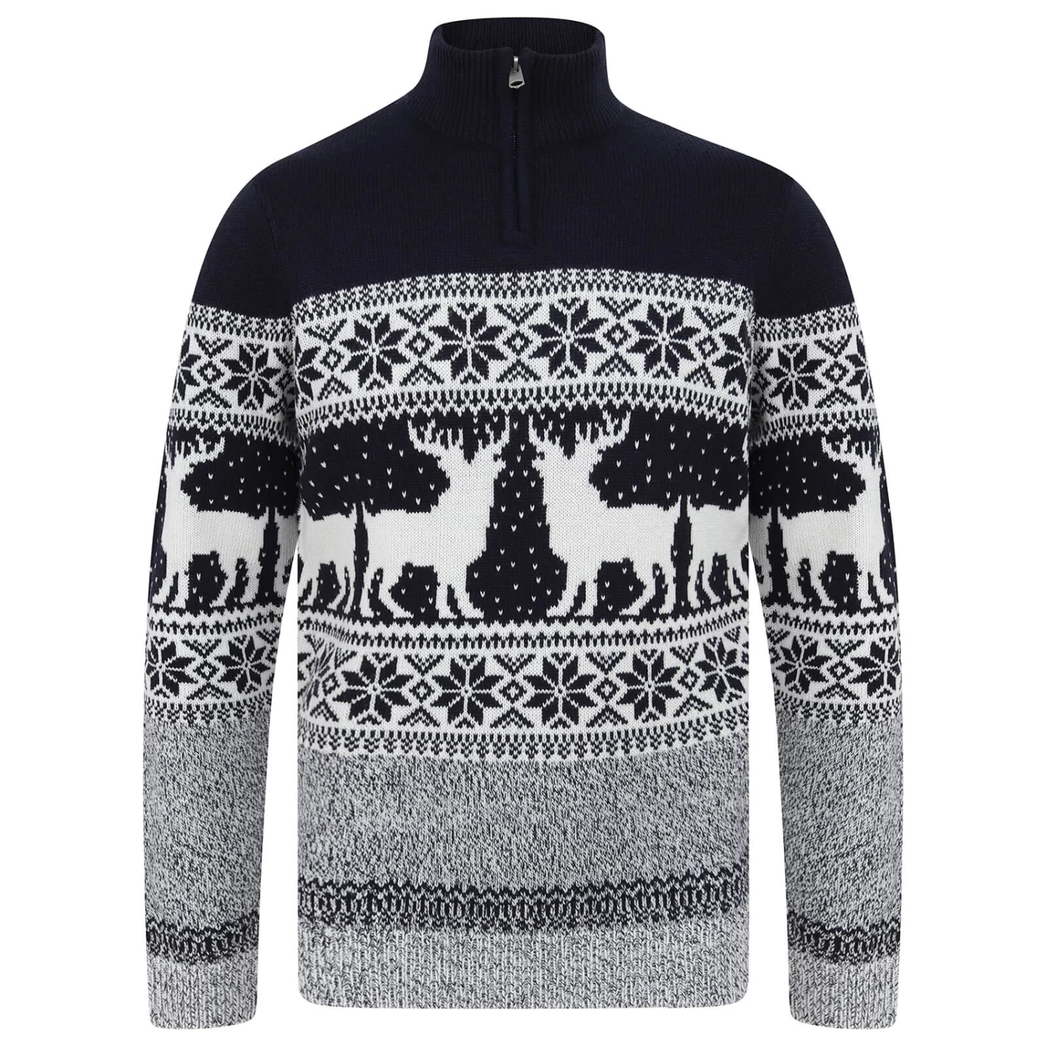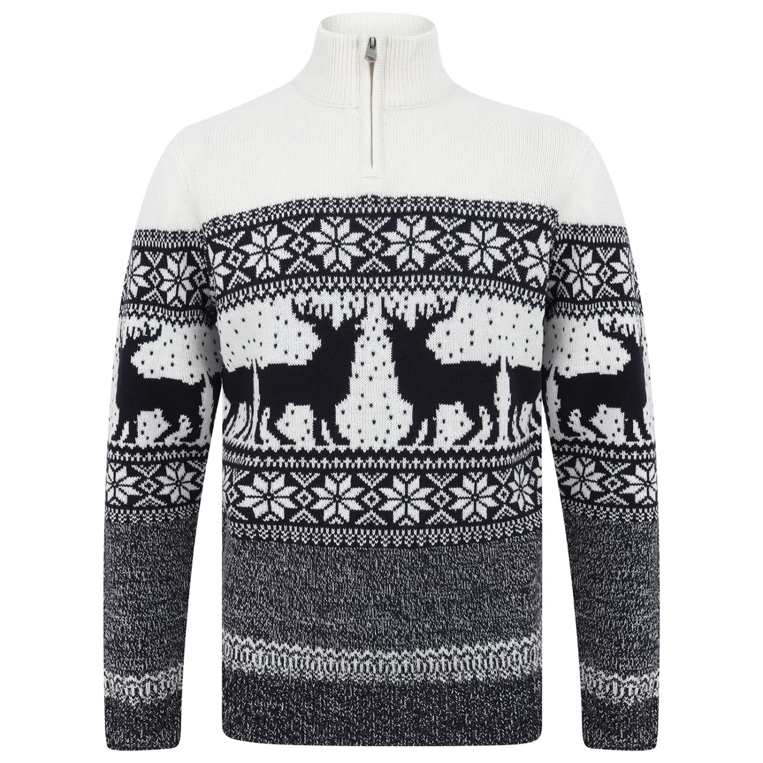 Enjoy the festive spirit in this novelty knit Christmas sweater. It features a Nordic style pattern with a reindeer and snowflake design. The high neck has a zip fastening for comfort. This fair isle Christmas jumper is available in Ink or Ecru in men’s sizes S, M, L, XL or XXL. Perfect for family seasonal celebrations and a great gift idea for the man in your life!