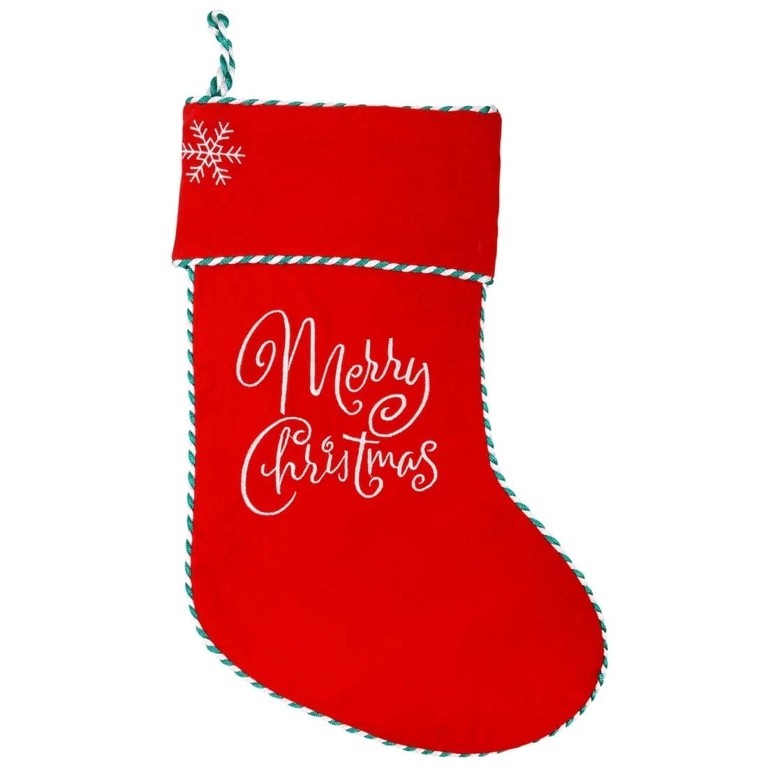 This fantastic stocking features a red velvet feel fabric front and soft fleece backing, a twisted green and white cord trim, white embroidered “Merry Christmas” text and snowflake. Complete with hanging loop for easy attachment to walls, fireplaces etc.