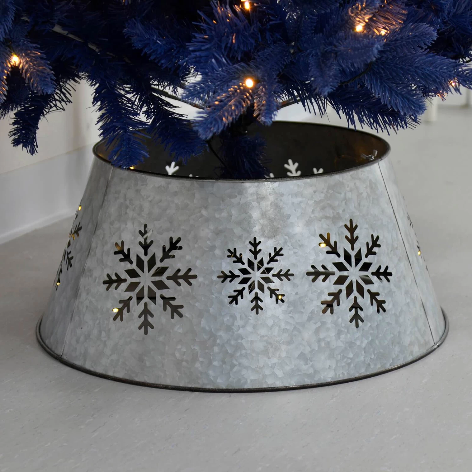 Suitable for artificial or real Christmas trees, this tree collar features a stunning snowflake design, illuminated by 24 warm white lights, and finished with a stylish silver pattern; a simple yet elegant addition to your Christmas decor.