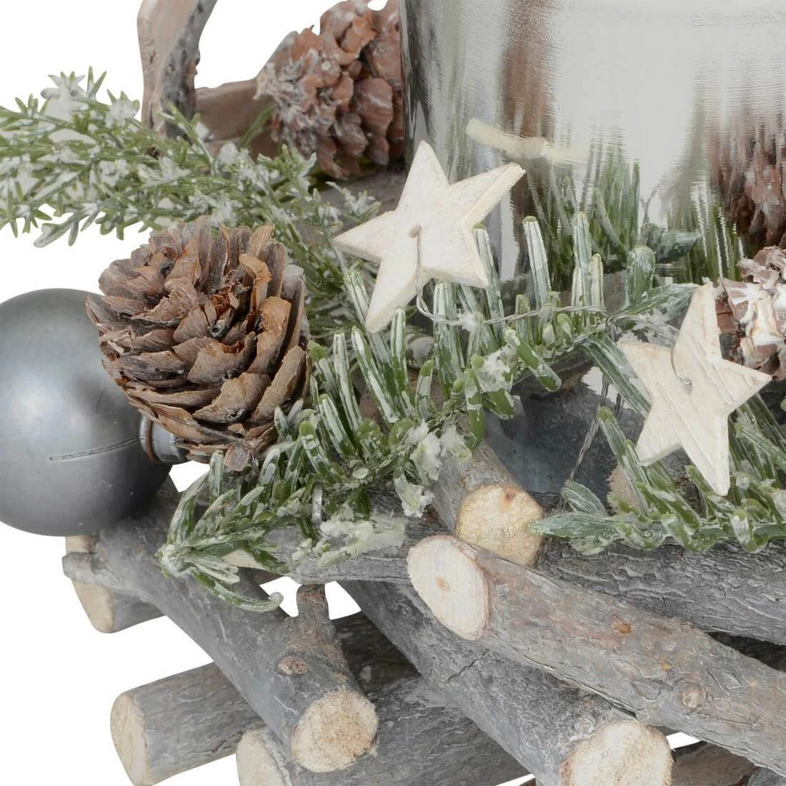 The holder has a round grey wooden stick base that has been decorated with pine cones, wooden stars, silver baubles and mixed green foliage.