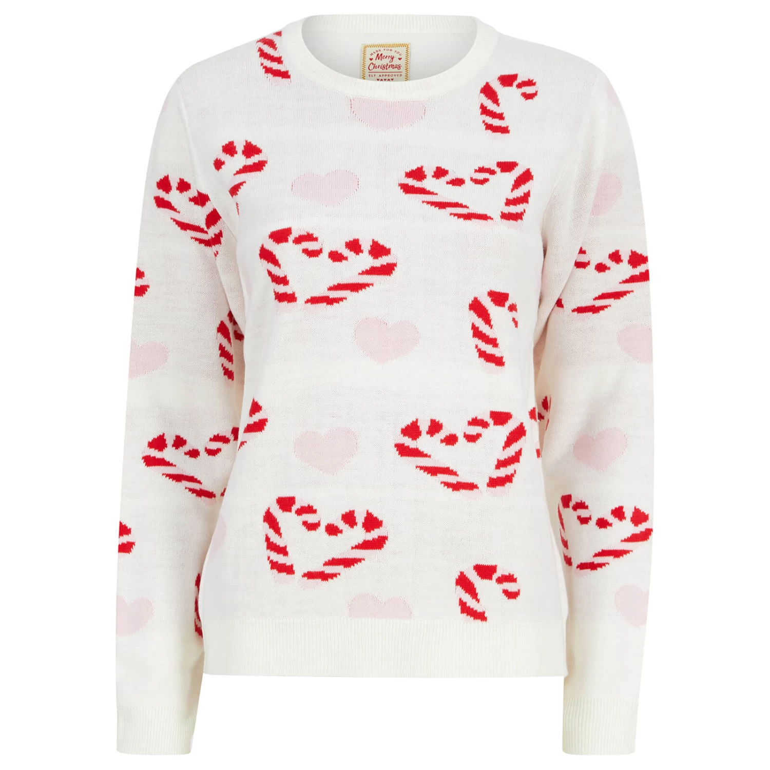 This bold pattern Christmas jumper for women features candy canes in a love heart shape and pale pink hearts.