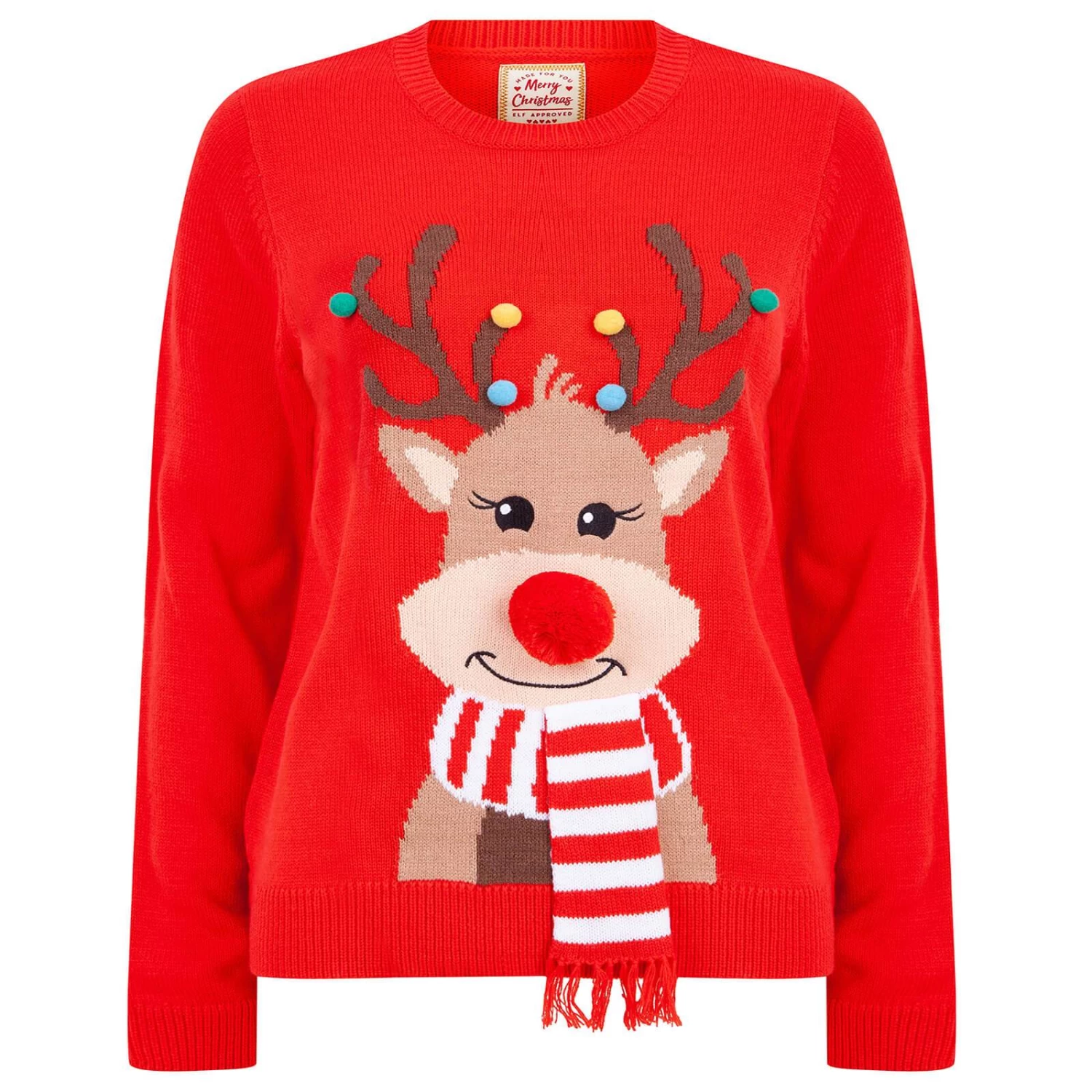 Womens Christmas Jumper Rudolph Reindeer Red Pom Pom Scarf