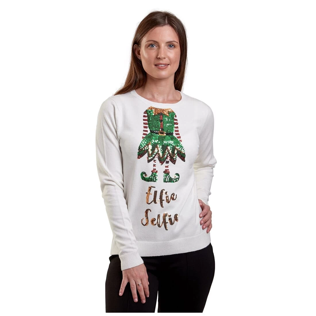 This novelty Christmas sweater is a soft thin knit fabric with “Elfie Selfie” slogan and elf dress design in sparkling coloured sequins. Choose from black, cream or red designs. The crew neck Christmas knit top is available in ladies UK sizes from 8 to 18. Perfect for the office party, Christmas dinner with your family or a great gift idea for the lady in your life!