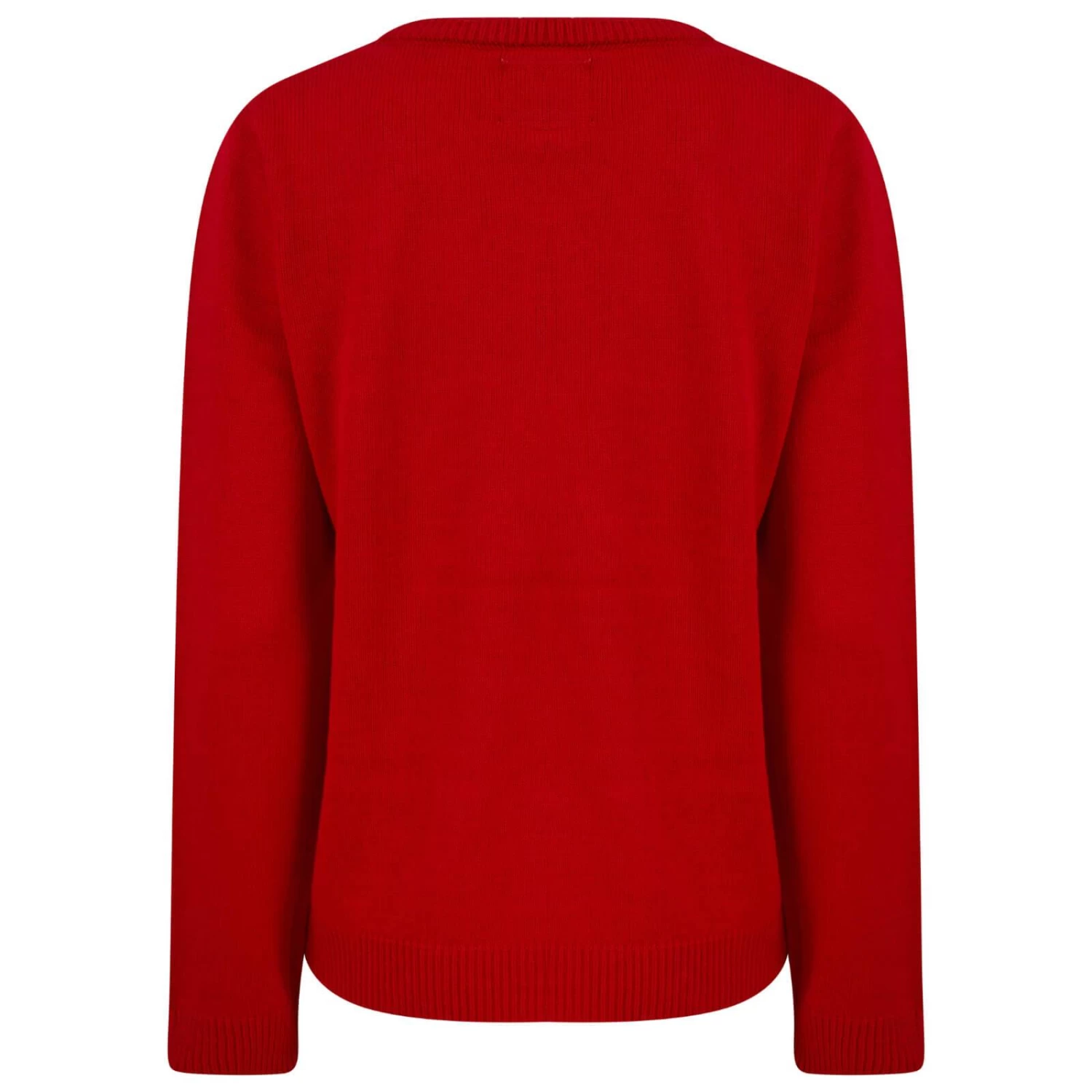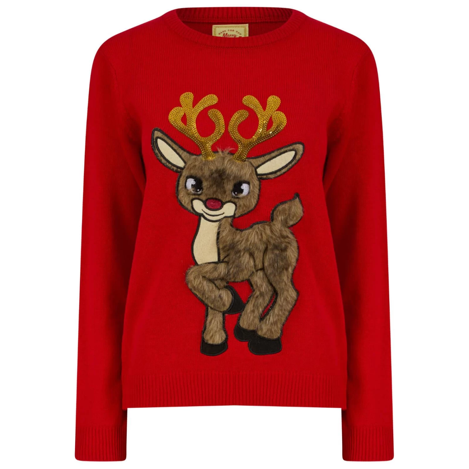 This fabulous ladies Christmas jumper features a very cute happy prancing reindeer complete with a red nose, gold sequin antlers and a faux fur face and body.