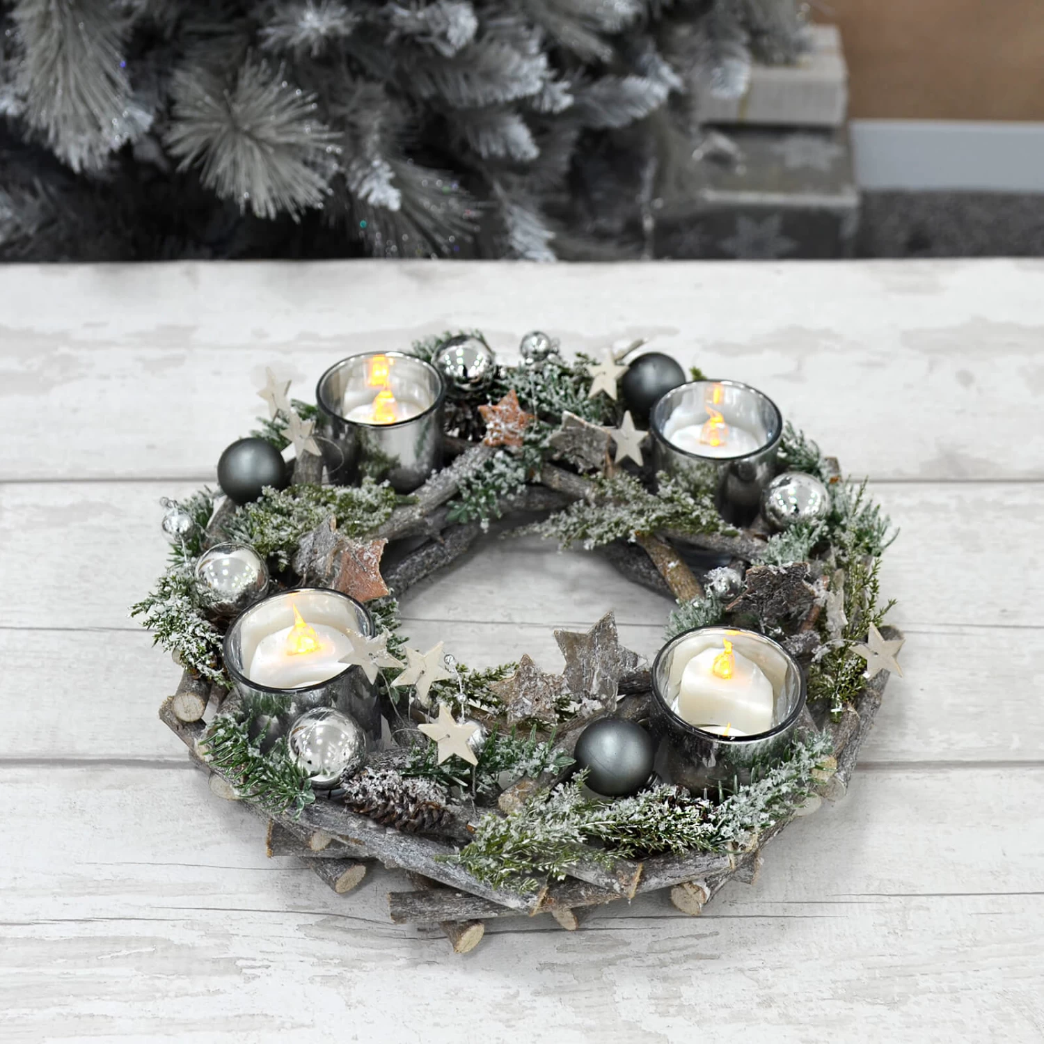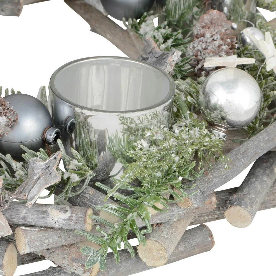 Around the wreath, there are 4 silver glass jars, these are removable allowing you to clean them easily or use them without the wooden stand.